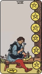 The Eight of Pentacles ကတ်က သင်ဟာ အလုပ်မှာ လုံ့လဝီရိယရှိရှိ၊ စည်းကမ်းရှိရှိနဲ့ အလေးအနက်ထားပြီး လုပ်ဆောင်နေတဲ့ အဆင့်တစ်ခုမှာ ရှိနေတယ်ဆိုတာကို ညွှန်ပြနေပါတယ်။ ရလဒ်တွေ ချက်ချင်း မမြင်ရသေးရင်တောင်မှ သင့်ရဲ့ကျွမ်းကျင်မှုတွေကို မြှင့်တင်တာ၊ အသိပညာသစ်တွေ ရယူတာ ဒါမှမဟုတ် ကိုယ့်ကိုယ်ကိုယ် နေ့စဉ်နဲ့အမျှ ပိုကောင်းအောင် ပြုပြင်နေတာမျိုးတွေ လုပ်ဆောင်နေနိုင်ပါတယ်။
