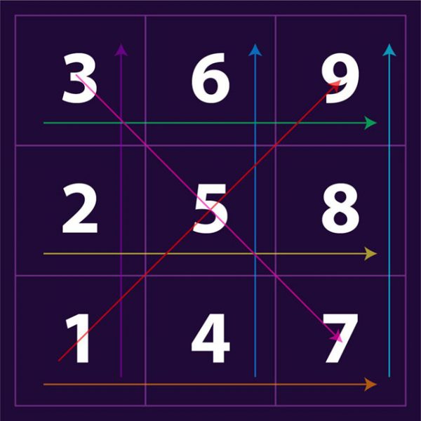အလျားလိုက်၊ ဒေါင်လိုက် သို့မဟုတ် ထောင့်ဖြတ်ဖြင့်ဖြစ်စေ ဆက်တိုက်ဂဏန်းသုံးလုံး၏ပုံစံများကို ရှာဖွေပါ။
